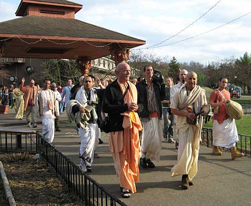 Another thing that you may see is when devotees circumambulate and go around the Deities in the sanctum of a temple, or even around the temple itself, or around sacred places, like special hills or even holy towns. This is called pradakshina. This is a means of recognizing the center point of our lives, the center of the circular path we take in honor of the Deities of the Lord, or something connected with Him. This is done in a clockwise manner so to keep the Deity on our right, which is the side of auspiciousness. So in a way, it is a reflection of going through life while keeping God in the center. Walking around holy sites is another way of undergoing austerities for spiritual merit. It is accepted that each step takes away some of our material karma, and thus helps us get free from the mundane affairs and worldly consciousness which causes us to undertake the actions which create our karma, which helps free us from further rounds of birth and death. Respect can be shown to our superiors or parents by circumambulating them three times as well.